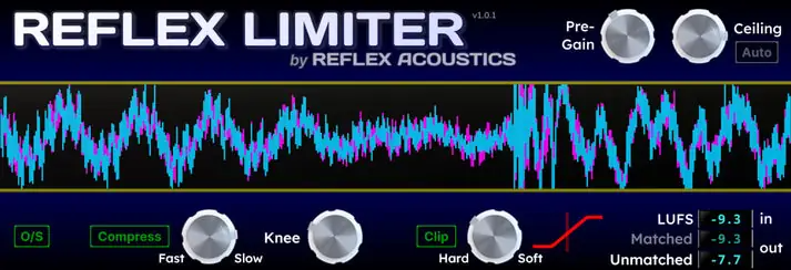 Lightweight limiter you can use anywhereThe Reflex Limiter is designed to transparently control the peaks in your signal, while remaining light enough on CPU that you can use it multiple times in your project. The device employs a fast-acting look-ahead compressor in series with a clipper.The compressor alone does not necessarily limit peaks, but it reduces workload for the clipper and allows for a cleaner sound. The device can also be pushed hard and made to produce crunchy distortion on individual tracks or buses.Features-6db to +18db Pre-GainCompressor and clipper can be independently deactivated (note that signal peaks may exceed the threshold if clipping is inactive)Auto Ceiling option sets the output threshold relative to your signal peaks, so that the Ceiling dial now controls how many decibels are removed from peaks—regardless of incoming level“O/S” button activates 2x oversampling (if clipping is activated, a backstop clipper will also be applied after downsampling in order to catch any new peaks introduced by the linear-phase antialiasing filter)Optional Matched-LUFS output for A/B testing or for using the device as a LUFS-neutral effectLeft & Right channel processing is 100% unlinkedHow to useTo A/B test, click “Matched” in the LUFS display, then click the waveform display to toggle Bypass modeHover the mouse over the plugin window to show peak input and output signal voltage over last 3s, as well as estimated CPU usageDouble-click to reset a dial to its default value, or hold / to fine-tuneTechnical notesAvailable in VST3 format for PC, and VST3 & AU formats for Mac. AAX support coming soonRequires a compatible Digital Audio Workstation or other plugin host0-16ms latency, depending on settings