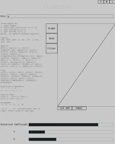 because normal distortions are boringTransfer is a waveshaper based distortion, except the transfer function is JIT compiled from text inputted by the user. Starting as a tool for testing different transfer functions in other projects, it has evolved into a pretty cool and unique plugin (disclaimer it might not be that unique I have done absolutely no market research whatsoever). It also has a built in gate, and an emphasis filter, which applies the filters to the signal pre waveshaping, then applies the exact opposite filter post waveshaping. Due to popular demand (by popular I mean that one guy on reddit), it now also has has 16x oversampling and you can’t turn it off sorry I don’t make the rules.what that means (how to use)there’s a list of functions / operators which is pretty hard to miss, and a text field after the H(s) = where you can type an expression in, and it will compile on return key press. In terms of variables, you have access to the input sample (x), the value from the distortion coefficient slider (d) (note: its range is 0 to 10, fairly arbitrarily), the value from the y slider (y), and the value from the z slider (z), which I’d recommend using as a volume control (more on in a sec..). There are also 4 general purpose registers (gpr[n], where n is the register you want to access), which can be used to store abritrary values. The registers get cleared on expression change, and there’s also a CLR GPR button below the filter panel you can use to zero them. The expression input supports conditionals;if(expr1 evaluates to true) expr2; else expr3;, and you can evaluate multiple expressions (from left to right) with the syntax ~(expr1, expr2, … exprn), where the last value of the expression is what gets returned. This means you can have different transfer functions depending on the whether the sample is increasing or decreasing when combined with the registers, if that’s something you’re into. Assignment is possible but a little weird syntactically, := is regular assignment. You can access the gate and filter panels with the respective gate and filter buttons, and get back to the graph view with, you guessed it, the graph button.health and safetyAs is the nature of something like this, it’s pretty easy to annihilate your headphones, speakers, eardrums, nearby wine glasses and small woodland creatures. If you’re messing around with this and aren’t sure what you’re doing (like me), I’d actually recommend turning down the volume on whatever is driving this to 0 before trying a function, and slowly turning it up, to be sure it’s not going to cause you physical or mental harm. if that falls on deaf ears (hint) please at least put your entire expression in parentheses, multiply by z, and turn the z slider all the way down before you hit enter. This paragraph is now longer than the instructions leading me to believe I have created a novel new WMD, but in all seriousness, be careful especially with logs, or anything that approaches infinity or anything wild in that vein. There’s a panic button below the graph, which will revert your transfer function to H(s) = x, which will just pass whatever input it has through the plugin, useful to avoid a visit to a&e or a noise complaint.